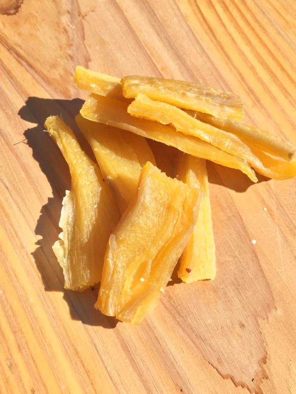 自然栽培(農薬は使わず、肥料は緑肥のみの畑です)で育てたサツマイモ「べにはるか」の干し芋です。
