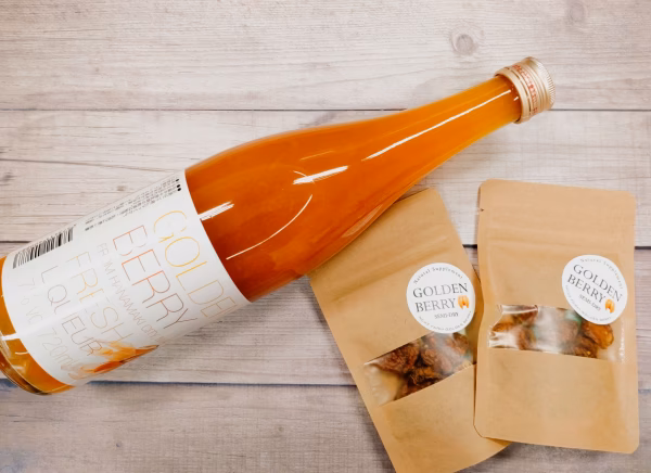 岩手県花巻産のゴールデンベリーたっぷりのフレッシュリキュールとセミドライゴールデンベリーをセットでお届けします😊