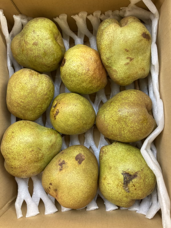 毎年大好評❗️フードロスゼロ😆 伝票来ましたらすぐ発送します! 5キロだと多いなーという方にピッタリ! 大玉のラフランスを3キロ7-10個位入れます😄 だいたい1個あたり300-500グラムの立派なラフランスです。 まだなるべく硬いうちに箱詰め発送していきます♪ ラフランス栽培をすると、必ず出る超スーパー超訳あり規格外ラフランスです!3キロバラ詰です! このラフランスは普通に売られているラフランスとは違い、虫に食べられてしまったラフランスです😭 写真のように、美味そうなラフランスの中に入っていきます笑  たいてい、ほんっと美味そうで、デカくて良いラフランスに入ります笑笑 逆に言いますと、虫が食べるラフランスは美味いんです‼️不思議ですねー、自然はうまくできています‼️ このようなラフランスは、普通のラフランスより、かなり早く柔らかくなり、早く食べられるようになります😄そして、甘くて美味い‼️ 当地では、このようなラフランスは、すぐ子どものおやつに真っ先に食べられます!ほとんど食べられるので、もったいないんです! もちろん、割ると中に虫食いの穴や、たまに虫がいることもありますが、どうせタネ周りは取ってしまうので、他はほとんど食べられます😄 そういうのを全く気にしない方は、ぜひご検討ください‼️ 注意❗️ラフランスは、内部褐変といいまして、割ると中が茶色くなってしまうラフランスが出る場合があります。ちゃんとした普通のラフランスも数%の確率でなる場合がありますので、あらかじめご了承くださると幸いです。 スーパーなどで買うより破格の値段で、ラフランスを楽しめます‼️しかも早く柔らかくなる笑 もちろん、昨年一昨年とご購入頂いた方には、ご案内しましたが、追熟と腐敗は紙一重で、追熟しながら、腐敗に向かうラフランスもでてきますので、ラフランスの様子を見ながら、お早めに召し上がるのが当地のパターンです😄 早く柔らかくしたい場合は、りんご🍎と一緒に温かい場所に置くとより早く柔らかくなります。 生食はもちろん、お菓子やジャム、スムージー、ピュレ、ケーキ、クッキー、ゼリー、ジュースなどにもお使い頂けます😄乾燥させるマシーンで、チップスにした方も昨年はおりました❗️ 虫食いなんて気にしないよー、って方はぜひご検討ください😄 下と上にネットをしいて、大きラフランスを選んで入れます❗️ 超スーパー超訳あり規格外につき、ノークレームノーリターンで、あらかじめご了承くださいませ😭昨年一昨年とバンバン売れまして、ご購入頂いた方は、どんなだかは、よくわかるかと思います。 配送時に、衝撃などで一部グチュってなるのもあるかもしれませんが、そこを取っても大玉なんで、たくさん食べられる部分があります😄 まだなるべく硬いうちに発送します♪ ご検討よろしくお願いします❗️