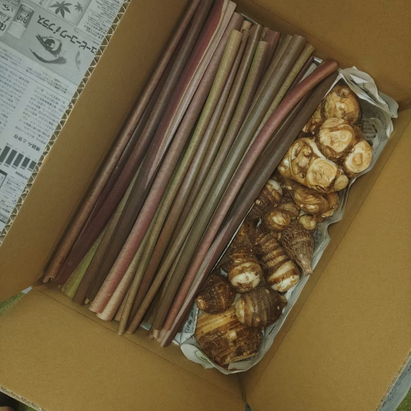 八ツ頭の茎の部分です。生の赤ズイキは、今だけの旬な野菜。食物繊維たっぷりで、酢の物、煮物、炒め物等に最適です。