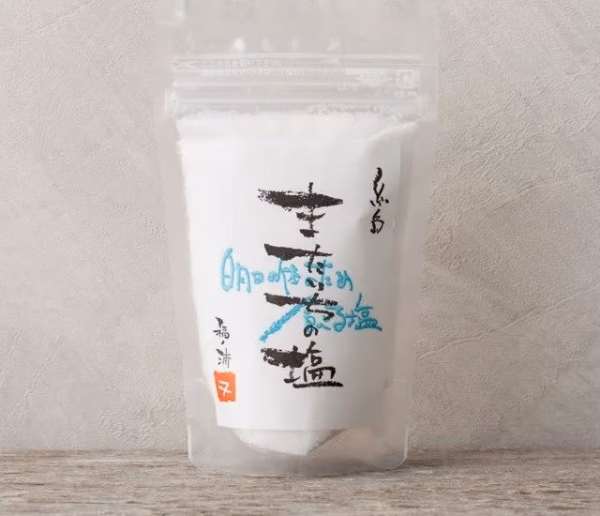 玄界灘の海水を立体塩田で濃縮させ、窯で3日間じっくり炊き上げて、取れたお塩を杉樽で寝かせてできたお塩です。