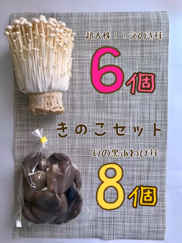 80サイズの箱にえのき茸を6株、黒あわび茸が約150g入った袋を8個入れてお届けします。