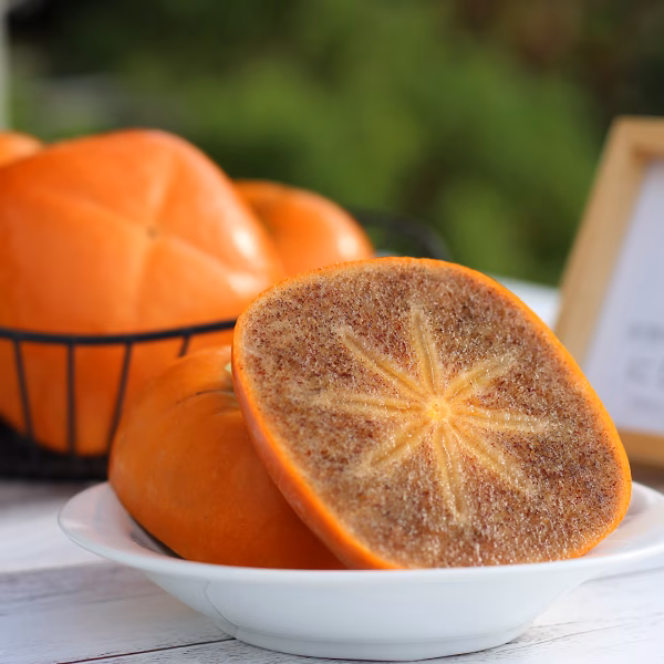 木に成ったまま完熟させるので、一般的な柿と比べて表皮の色が濃く、果肉には黒ゴマが入り、糖度が上がってとても甘くなっています。