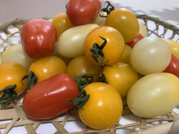 プラム型のミニトマトでは珍しい白色のミニトマトです。ジューシーで加熱調理すると甘みが増します♪