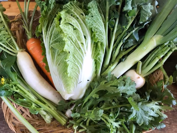 白菜1/2(小白菜1玉) 春菊60g 長ネギ1本 葉付きかぶ2個 菜の花or茎ブロッコリー にんじん おろし用小大根(おろしてポン酢にまた鍋に入れるとホクホクに) 柚子1玉 葉野菜(水菜等)