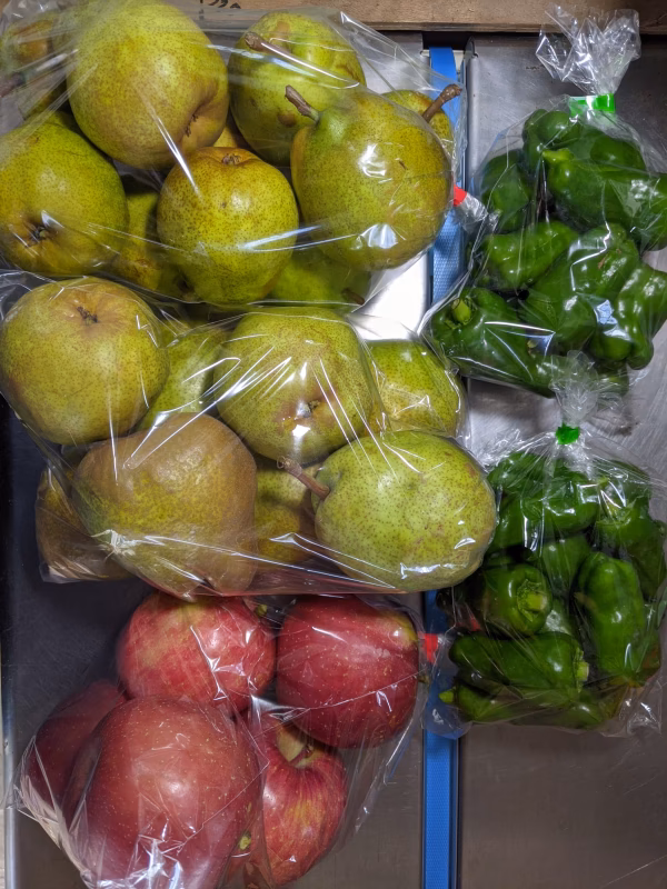 りんごは早生ふじで1.4kg、ラ・フランス小サイズ1.8kg、中サイズ2kg、ピーマン600gの詰め合わせです。