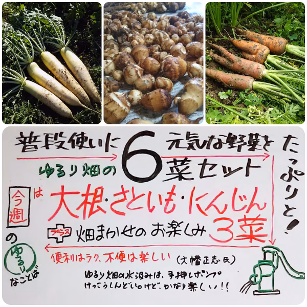 ゆるり畑の週替り6菜セットは、メイン野菜3種類とサブ野菜3種類の野菜セットです!