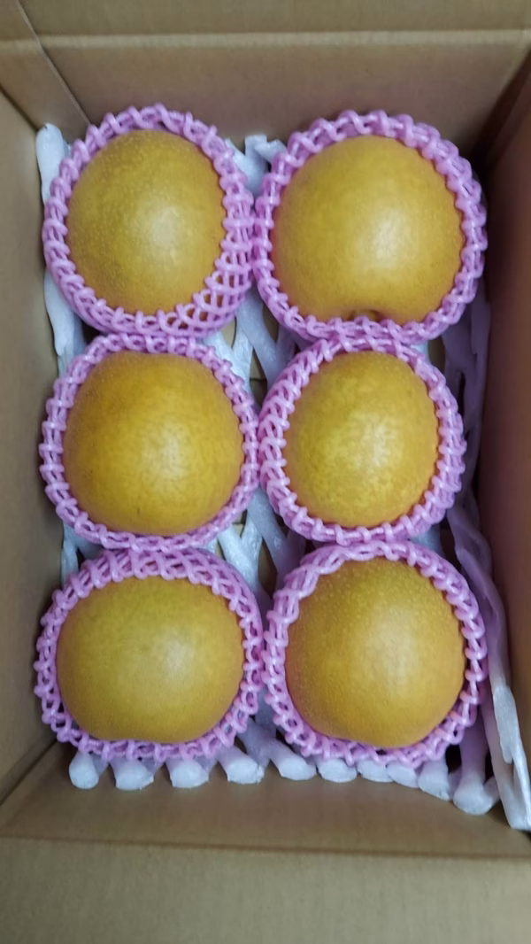 ラグビーボールのようなユニークな形の赤梨です!