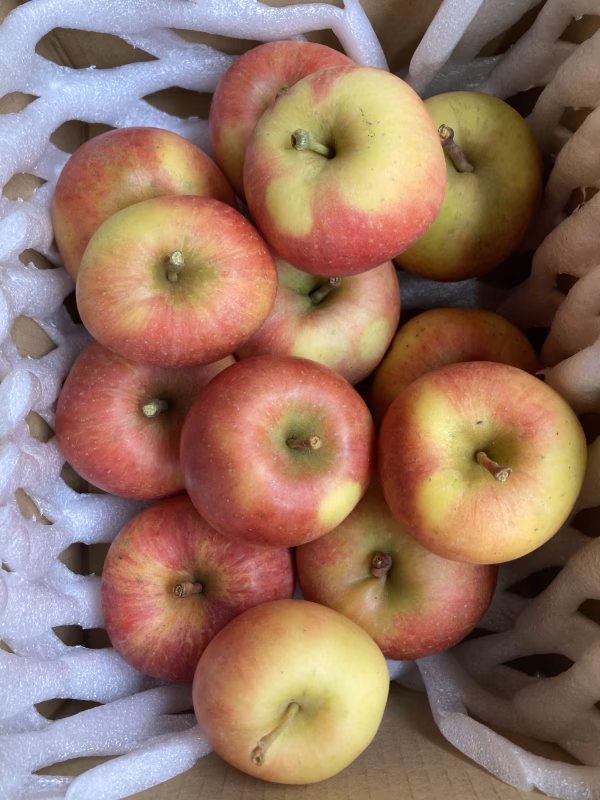 春先の霜害も受けかなり少ないですが、なんとか収穫までこぎつけましたが、めちゃくちゃ収穫量は少ないし、葉も10月末くらいには壊滅してるので、めっちゃ小さいりんごがたくさんです笑