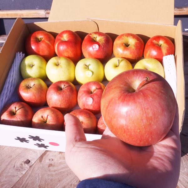 手のひらにすっぽりおさまる小玉サイズのりんご3種類を集めて箱詰めしました!!