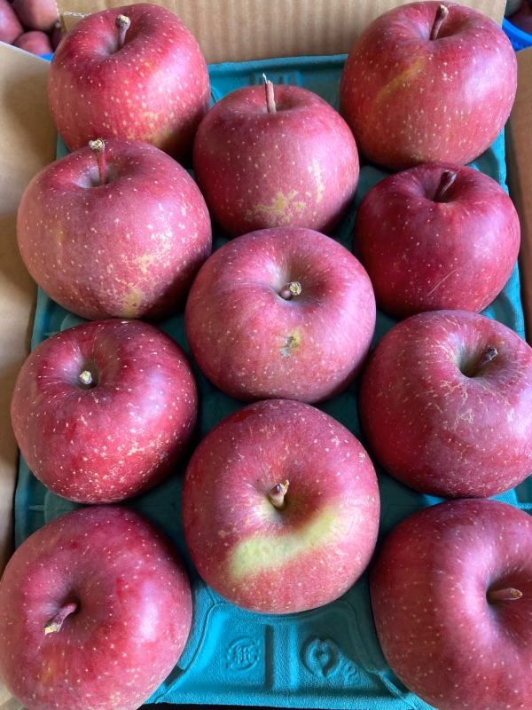 ※キズ、霜被害によるサビ(表面がざらざらとしている)、枝型・葉型(色がついていない部分がある)などの商品です。これによって味が落ちることはなく、生食でも美味しく頂けるりんごです。