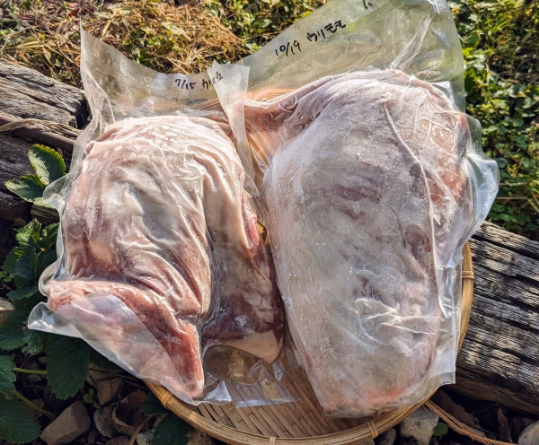 もうウリ坊とは言えないくらい育った大きさのイノシシを、6つに分割した骨付き肉、モモ(後ろ足)&ウデ(前足)の脚2本分:2パックを、真空パック・冷凍してお届けします。