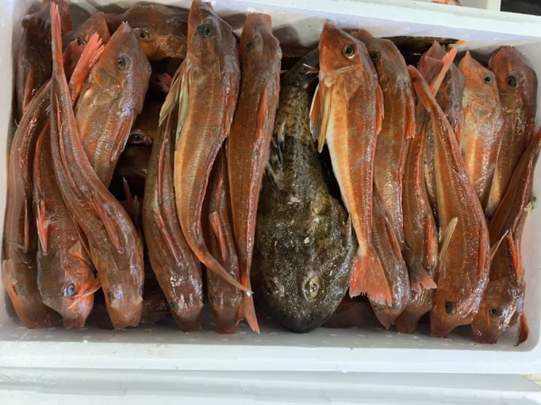 ▼商品ホウボウの仲間のカナガシラと他の魚種が入っている魚箱