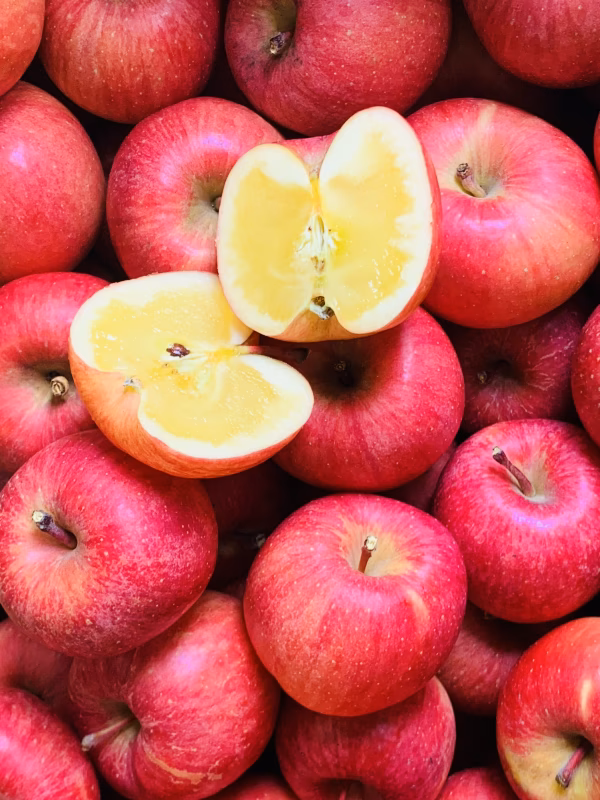 果肉は黄色でシャリ感もあり、酸味が少なくさっぱりした甘味。口に含んだ瞬間に広がる甘さと、今までに食べたどのりんごとも違う風味に驚くこと間違いなしです!