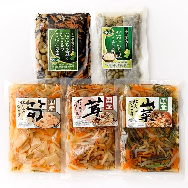 この商品は従来の人気商品の筍・茸・山菜炊き込みご飯の素3種に、枝豆(だだちゃ豆)ご飯の素2種を加えた5種セットです。調理も簡単仕様ですのでお手軽にお召し上がりいただけます。