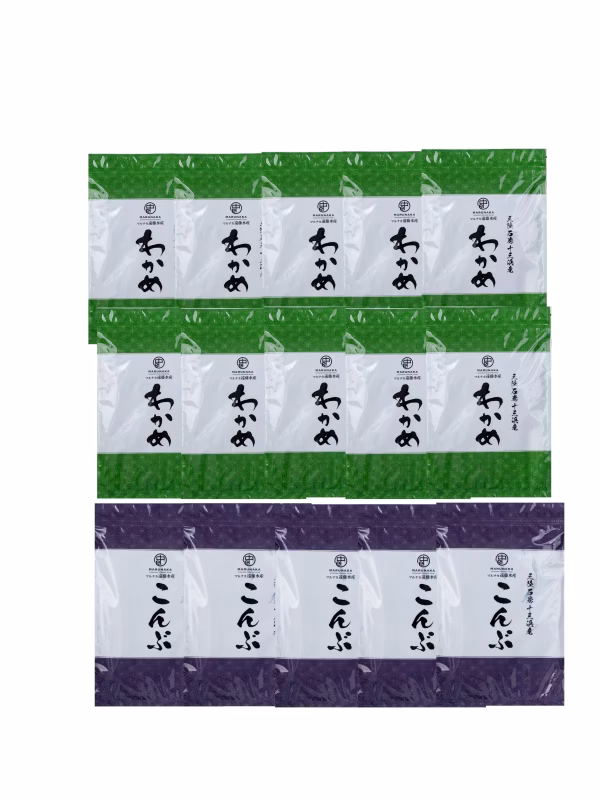 - ●わかめ 名称:湯通し塩蔵わかめ 原材料:わかめ(十三浜産)、塩 内容量:120g ●こんぶ 名称:湯通し塩蔵こんぶ 原材料:こんぶ(十三浜産)、塩 内容量:300g 製造者:宮城県石巻市北上町十三浜字大指89-2 ㊥マルナカ遠藤水産 遠藤俊彦