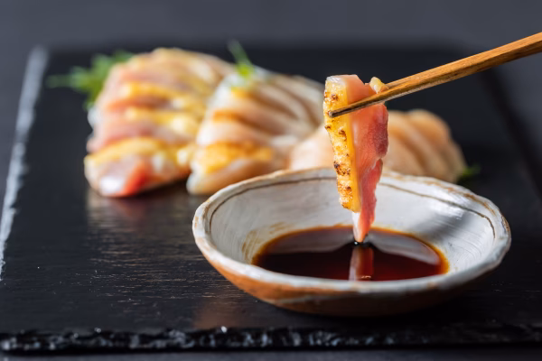- 鶏刺し:鶏肉(鹿児島県産黒さつま鶏) さしみ醤油:アミノ酸液(国内製造)、小麦、脱脂加工大豆、食塩、砂糖、ぶどう糖果糖液糖/カラメル色素、アルコール、調味料(アミノ酸等)、甘味料(ステビア、甘草)、ビタミンB1