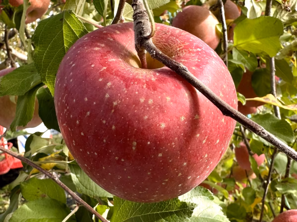 🍎サンふじりんごの「サン」は「太陽(SUN)」を意味していて、袋をかけずに太陽の光をたくさん浴びて育ったことを指しています。無袋栽培で育てたことにより光をたくさん浴びるので甘味が増して味もよいとされます。