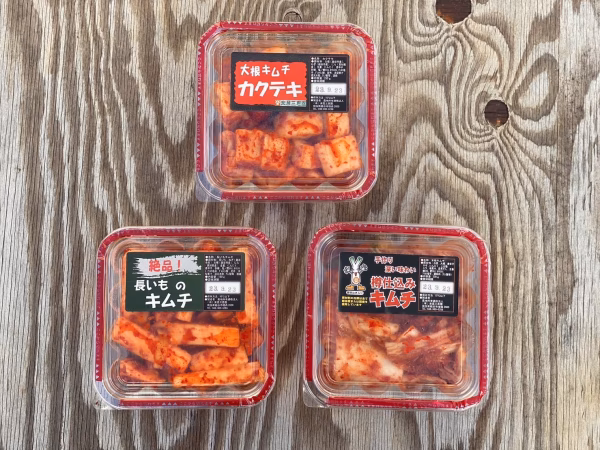 白菜キムチ:白菜、大根、唐辛子、ネギ、ニンニク、砂糖、塩、ニラ、昆布、生姜、アミの塩辛、鰹エキス、カマスエキス、還元水飴、洋梨果汁、アミノ酸等、酒精 カクテキ:大根、唐辛子、ネギ、ニンニク、砂糖、塩、ニラ、昆布、生姜、アミの塩辛、鰹エキス、カマスエキス、還元水飴、洋梨果汁、アミノ酸等、酒精 長いもキムチ:長いも、大根、唐辛子、ネギ、ニンニク、砂糖、塩、ニラ、昆布、生姜、アミの塩辛、鰹エキス、カマスエキス、還元水飴、洋梨果汁、アミノ酸等、酒精
