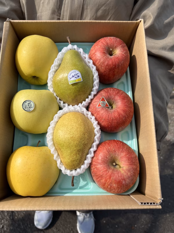 山形の美味しい果物詰め込んだ、中玉サイズの2種のりんご🍎🍏と今が旬の洋梨シルバーベル🍐の詰め合わせになります。