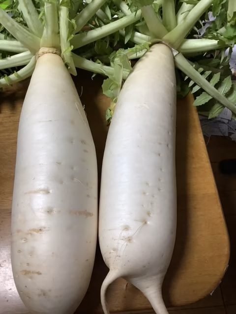 ▼学校給食用に栽培しているため、安全性には特にこだわり、農薬、除草剤はもとより肥料も一切使っていません。味が良くなくては食べ続けられないので、味のいい品種を選んでいます。 ▼大根です。 ▼大根 ・三浦大根=煮込み料理で実力発揮!昔ながらの三浦大根。甘みが強く、煮大根として絶大な人気を誇ります。 ▼三浦大根2本 4~5キロ程度。 ▼学校給食用に栽培しているため、安全性と栄養価の高いことにこだわって栽培収穫しています。