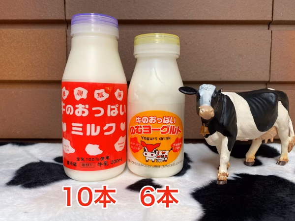- 牛のおっぱいミルク 200ml×10本、のむヨーグルト150㎖×6本 冷蔵で10℃以下で保存 賞味期限 8日〜15日