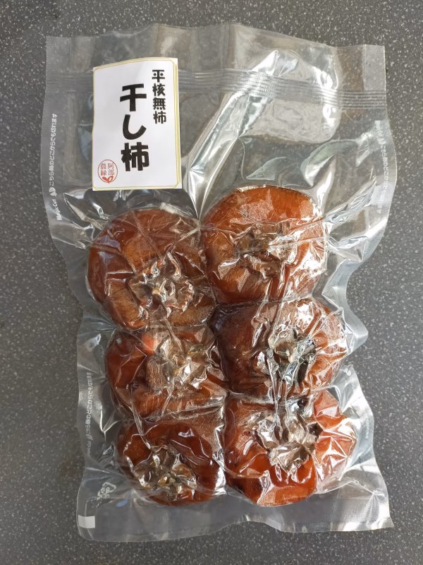 干し柿をひとつひとつラップでくるみ、更に真空パックしたものを冷凍でお届けします。食べる時には、前日位に冷蔵庫に移しておくか、常温で解凍してもいいです。