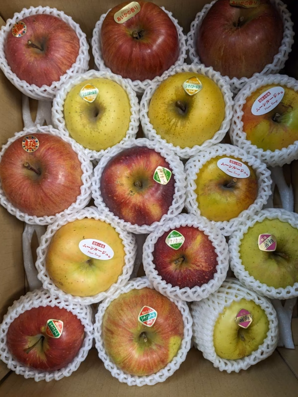 サンふじ、ぐんま名月、あいかの香り、ムーンルージュ、シナノスイート、シナノゴールド、シナノホッペの7玉セットです!