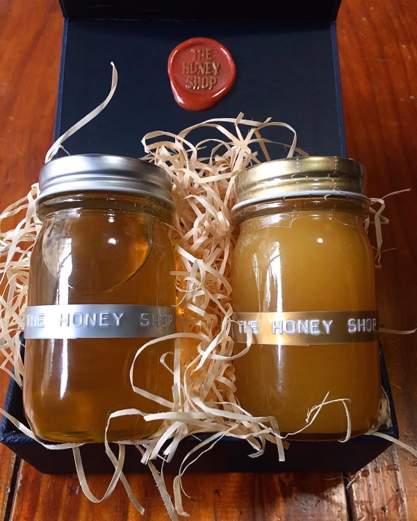 100㌘のたれ蜜一本と、100㌘の花粉蜜一本の計2本にハニーディッパーを2本お付けしていたしまして贈答用の品として御用意させていただいた、ラインナップで御座います。