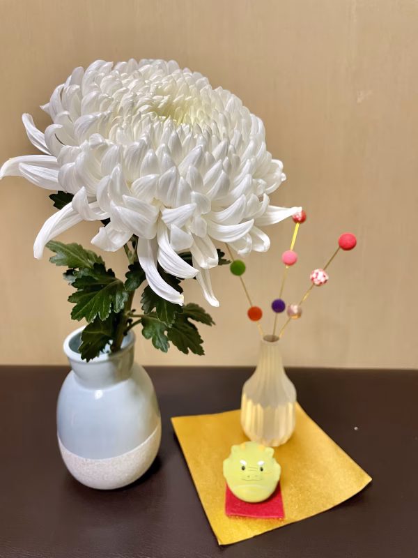 ◎クリスマスやお正月のインテリアに。 ◎お気に入りの花瓶に一輪挿しでも、  他のお花とのアレンジでも。 年末年始、家族やお客さんをお迎えする、玄関に。 おうち時間をゆっくり過ごす、お部屋に。 フルブルームマムの清らかな白色が、きっと見る人の心を癒してくれることを願って。ひとつひとつのお花に、心を込めてお届けします。 ▼フルブルームマムとは? 「満開の菊」full bloom mum 通常の菊は蕾の状態で収穫するところ、フルブルームマムはしばらく土に根付かせて十分に栄養を蓄え、花が大きく開いてから収穫します。 頭にネットをかけているのは、花が傷つくのを防ぐためです。菊とは思えないような、モフモフしたボリュームで存在感があります。 【自己紹介】 はじめまして。 『あまくさの菊』荒川宏美です。 たくさんの出品の中からご覧いただきありがとうございます。 菊農家に嫁いで、早5年。 これまで作っても販売してこなかった フルブルームマム。 こんなにかわいいのに、もったいない!と 嫁の私がポケマルでの販売をスタートしました。 供花で高貴なイメージがある白い菊ですが グリーンと合わせてシンプルに、 他の花と合わせてカジュアルに、 普段の暮らしでも飾っていただけると嬉しいです。 『あまくさの菊』Instagram https://www.instagram.com/amakusanokiku?igshid=YzAwZjE1ZTI0Zg%3D%3D&utm_source=qr 【農園について】 私たちは、夫、夫の父・母・祖父の家族経営で、輪菊(白)を専門に栽培しています。天候や気温に応じてハウス内の温度・水分・日照時間の調整や土壌改良を行い、菊の育ちやすい環境を整えています。特に、病害などのリスクに備えて丁寧な管理を心掛けております。 【産地について】 「花のまち」熊本県上天草市大矢野町。 1966年、九州本土と天草諸島を結ぶ「天草五橋」が架かりました。 このとき、上天草で露地栽培されていた花々が多くの観光客の目にとまり、「花のまち」として認知されるようになったと言われています。 海と山に囲まれ、温暖な気候と水はけの良い土壌に恵まれており、熊本出荷量全国1位であるカスミソウをはじめ、様々な種類の花が育てられています。 花農家同士で、日頃の情報交換をはじめ、人手が足りない時は手伝いに行ったりと結びつきも強いです。 年に一度、大矢野町で開催される花まつりは、花の魅力を伝えようと花農家が一体となって取り組むイベントで、多くの来訪者で賑わいます。 【商品概要】 フルブルームマム(一輪菊:白) 品種:精の一世(夏)、晃花の富士or神馬(冬) 長さ50㎝ 納期は最短1~3日 【お花が届いたら】 ○頭のネットを外すときは、花びらが痛むのを防ぐため、引っ張るのではなく破いて外してください。 ○菊は日持ちの良い花ですが、暑さに弱いためできるだけ涼しい場所に置いてください。 特に、暖房機や日の当たる場所を避けてください。 毎日、新鮮なお水に取り替えてください。 茎や葉が痛んできた時は、茎の下から2,3㎝をハサミで切ってください。
