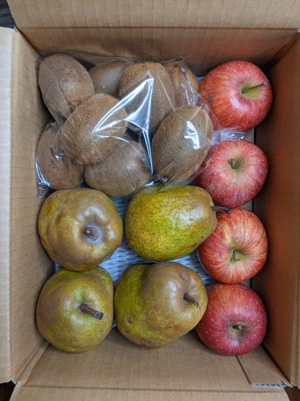 キューイは約1kg、ふじりんごミニサイズ4個、ラ・フランス大サイズ4個入りです。