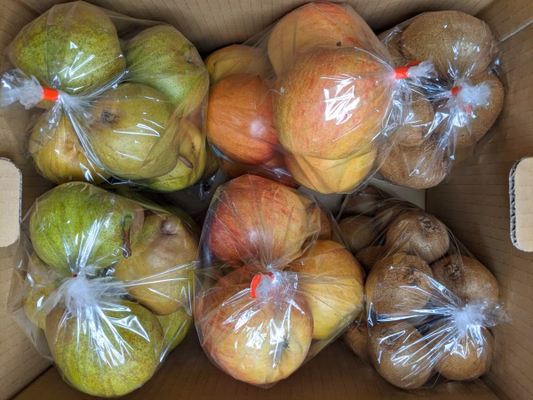 キューイ34個、りんご14個、ラ・フランス20個の詰め合わせです。全て小サイズです。