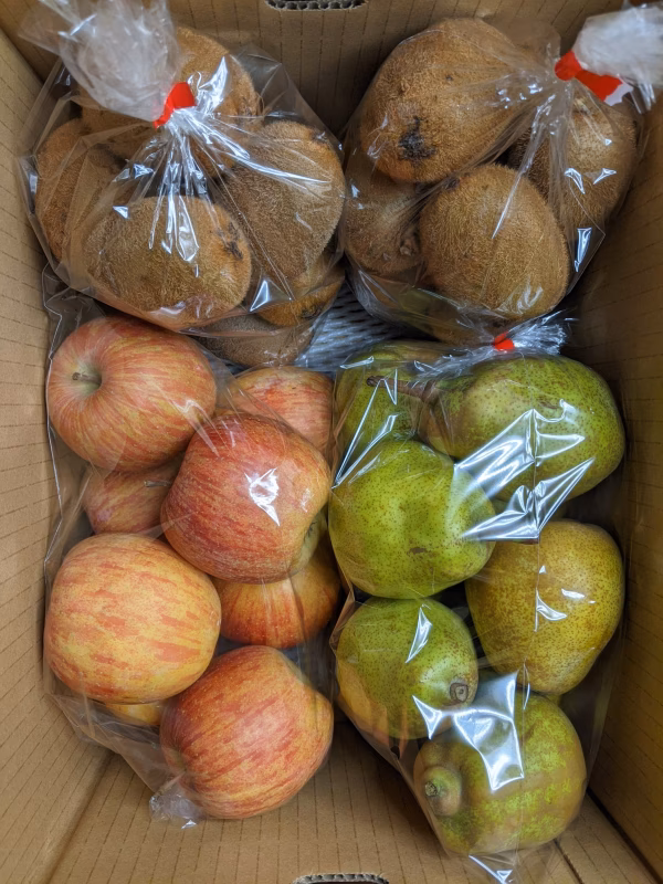 キューイ2kg、ふじりんごミニサイズ8玉、ラ・フランスミニサイズ10個の詰め合わせです。
