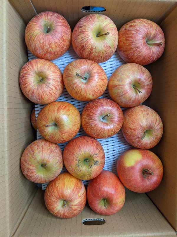 ふじりんごMサイズを2段重ねにして28玉詰めております。