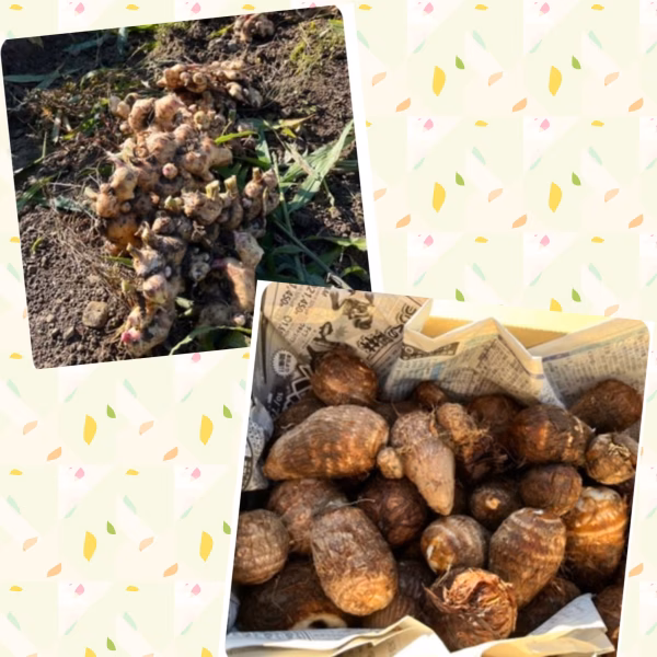 今期の収穫分の土付き生姜と里芋になります。 2023.11月収穫分 内容量 土付き箱込み2㎏未満です! 生姜 約1キロ 里芋 約1キロ 有機栽培にこだわって栽培しております! 収穫後は壕にて年中適温で保管しております。 ※乾燥を防ぐため袋に入れて壕にて保存中のため、発送時には土や商品に湿り気がある状況で届きます。 希望重量などご希望があればコメントお待ちしております! 単品での出品もしています。