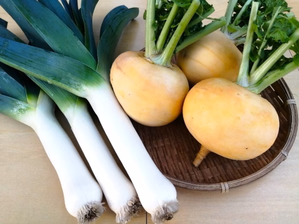 寒い季節にぴったり‼煮込み料理などに最適な黄カブ(3~4玉)とリーキ(3~4本)。