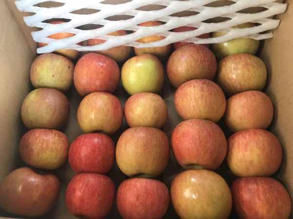 収穫直前まで葉から旨味と養分を送られたりんごたちは着色むらがありますが、養分豊富な力強いりんごに育っています。