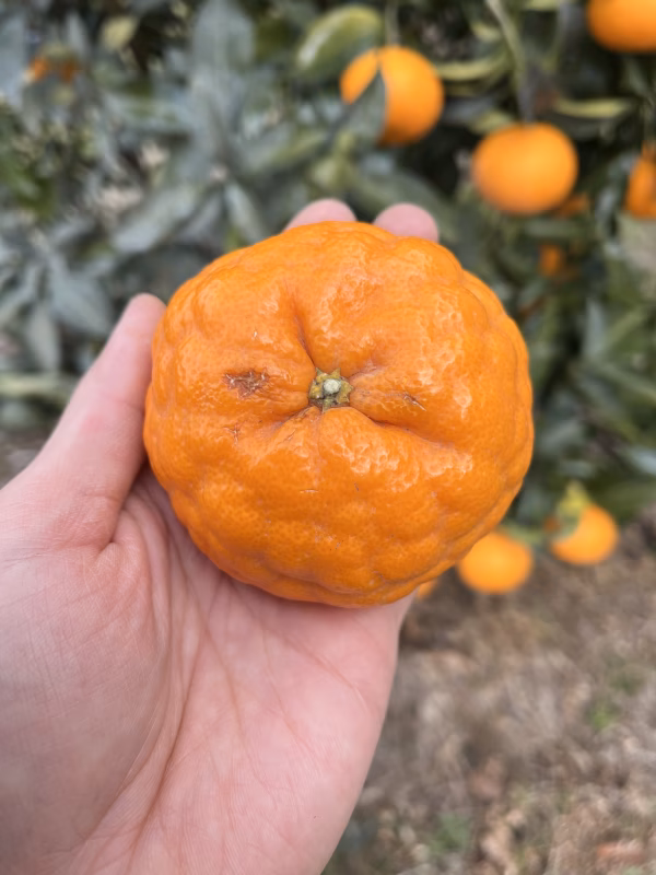 糖度が高くて薄皮は極薄・ぷりぷりの果肉♪ 清見よりも早熟で皮も手で剥くことができる!ポンカンよりも果汁があるいいとこ取り! でも、栽培が難しいのもあり不知火より知名度も低く市場には出回りづらい品種。