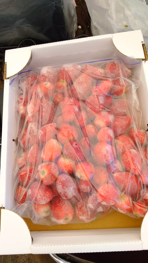朝に収穫して、ヘタを取って冷凍しています、冷凍いちごをお届けします。