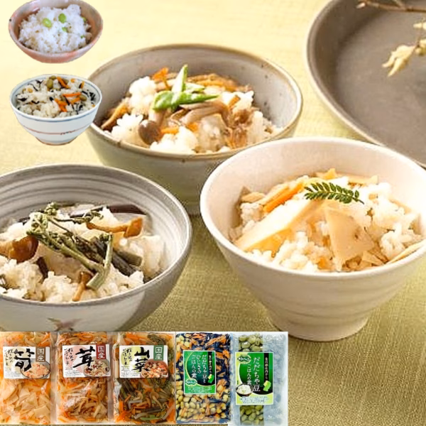 この商品は従来の人気商品の筍・茸・山菜炊き込みご飯の素3種に、枝豆(だだちゃ豆)ご飯の素2種を加えた5種セットです。調理も簡単仕様ですのでお手軽にお召し上がりいただけます。