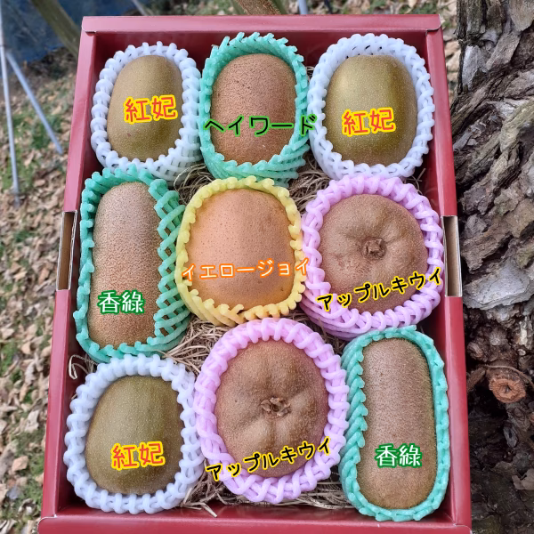 ▼自己紹介 和歌山県かつらぎ町で専業農家を営んでいるどんぐりふぁーむです。和歌山県はキウイフルーツ生産量全国3位でもあり、とても熱心に栽培しています。 ▼商品概要 どんぐりふぁーむ産キウイフルーツ5品種食べ比べセット。 ヘイワード・紅妃・イエロージョイ・アップルキウイ・香緑です。 只今お買い上げいただいた方には、どんぐりふぁーむ産キウイフルーツのドライフルーツ(小袋)をプレゼントさせていただきます。 ご一緒にお楽しみください。 贈り物にもできるように箱詰めしています。 ▼品種・味の特徴・食べ方 ①ヘイワード・果肉は緑色。一般的に良くお目にかかるキウイです。到着後食べ頃まで1週間程度室温で追熟させてください。 ②紅妃(こうひ)・果肉は黄色で中心部が赤色。酸味がほぼ感じられません。完熟に達するのが早いため食べ頃の状態でお届けすることができます。 ③イエロージョイ・果肉は黄色で中心部が半透明。お届けから2、3日後が食べ頃です。 ④アップルキウイ・果肉は黄色。リンゴのような形。到着後食べ頃まで1週間程度室温で追熟させてください。 ⑤香緑(こうりょく)・果肉はヘイワードより少し濃い緑色。俵形。到着後食べ頃まで1週間程度室温で追熟させてください。 ▼数量、分量の目安 1箱9個入りを2セット ▼栽培/生産方法、こだわり 植物の生育と食味のために有機肥料を使用しています。 ▼注文に際しての注意点(配送方法や納期指定など) 発注後1~7日で発送させていただきます。