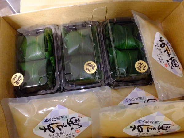 耕太郎農園で作った「こがねもち」の生地の中に、地元のおばちゃんが収穫した小豆を耕太郎が練り上げた餡子をいれ、国産の笹で包みました。