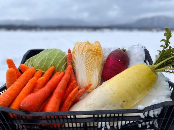 キャベツ、白菜、大根(三太郎・紅くるり・紅心大根)、さつま芋(紅はるか)など、丹後自慢の冬野菜を2~3種類プラスして、100サイズのダンボール箱に詰め込んでお届けします。
