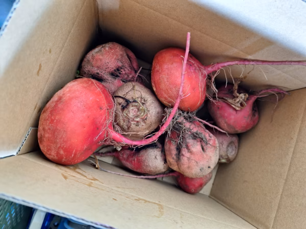 輪切りにすると花丸のような渦巻き模様のビーツをサイズミックスで4.5キロ箱詰めします