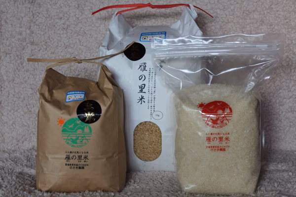 宮城県登米市では、毎年冬季に天然記念物の雁が20万羽ほど越冬しています。人が健康で美味しいものを毎日楽しめるように、そして、雁などの動物が元気に生息できる安全な自然環境がいくらでも広がるよう、この想いを込めて「雁の里米(かりのさとまい)」と名付け、農薬・化学肥料不使用(宮城県農産物認証 特別栽培米)で栽培しています。
