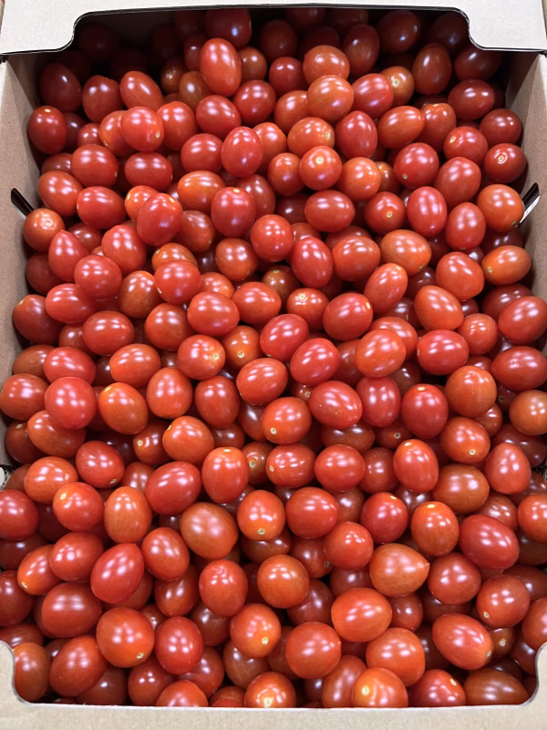 (アイコ)ミニトマトをダンボールに入れてトマトの傷や割れをチェックして箱詰めをします。箱詰めの時は全力尽くして割れ、傷を見て検品をします。