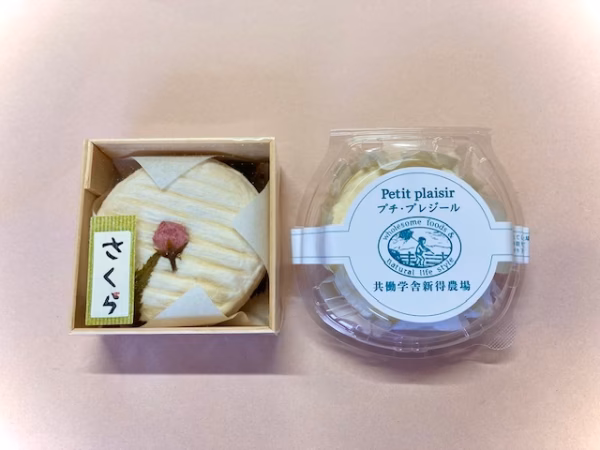 当舎のプチ・プレジールという、手のひらサイズのソフトタイプのチーズに桜の葉で香りをつけ、日本独自の微生物の力を借りるために日本酒の酒粕も入れております。十勝のエゾヤマザクラから取れた酵母も使用しています。和風のチーズの味わいを是非お楽しみください。