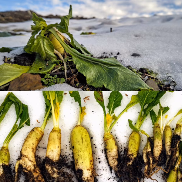 2月半ばは2m近くの雪がまだ残る時期ですが、暖冬で通常より1ヶ月も早くふきのとうが出ており、雪の降る前か3月半ば頃に掘れる菊芋、雪の下から出てきた焼畑の宝谷かぶ(在来作物)