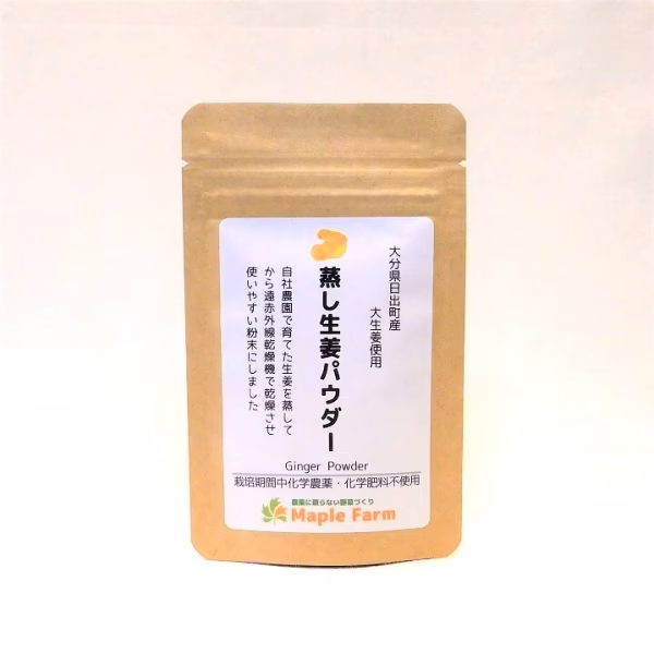 海と山に囲まれた自然豊かな大分県日出町(ひじまち)で栽培期間中農薬・化学肥料不使用で栽培された生姜を使用した、農家手づくりの生姜粉末です。