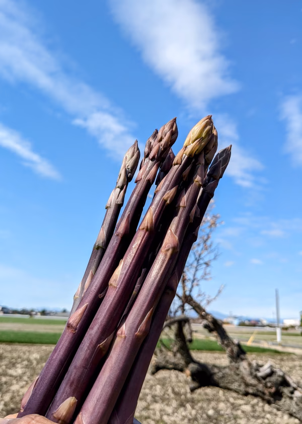 紫アスパラガスは、今の春芽の時期が惚れ惚れする綺麗な紫色をしています。気温が高くなってくると着色が悪くなる性質ですので、今の時期の紫アスパラを目と舌でお楽しみ頂ければ幸いです。